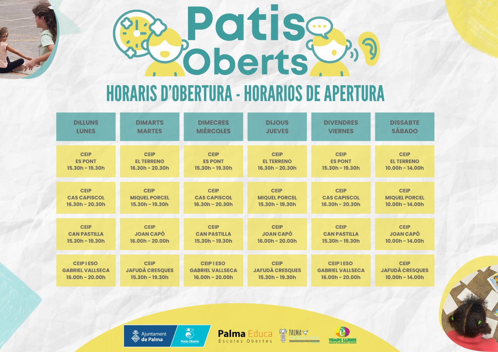 Tindreu de dilluns a disssabte 8 patis de centres educatius públics de Palma oberts per a realitzar activitats lúdiques amb un servei de monitoratge.